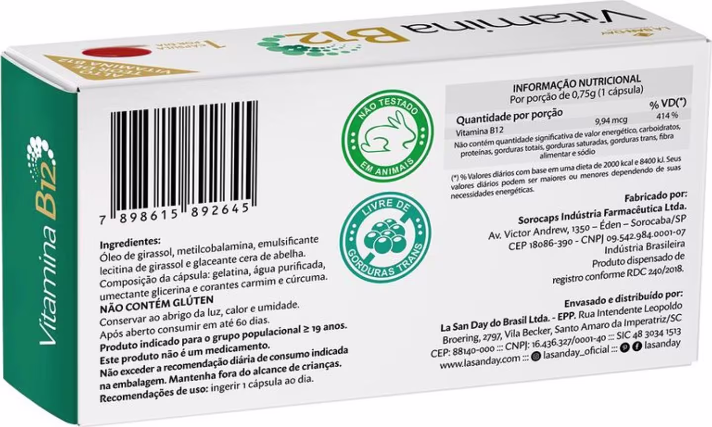Vitamina B12 750mg Lasanday Com 30 Capsulas Softgel Energia Ver mais ❯