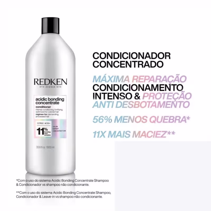 - O Condicionador Redken Acidic Bonding Concentrate é enriquecido com um sistema de reparação concentrado, desenvolvido para cabelos secos e danificados. Sua ação oferece o máximo em reparação, força, condicionamento intenso e proteção contra o desbotamento da cor do cabelo, além de ajudar a equilibrar o pH para um cabelo mais saudável.