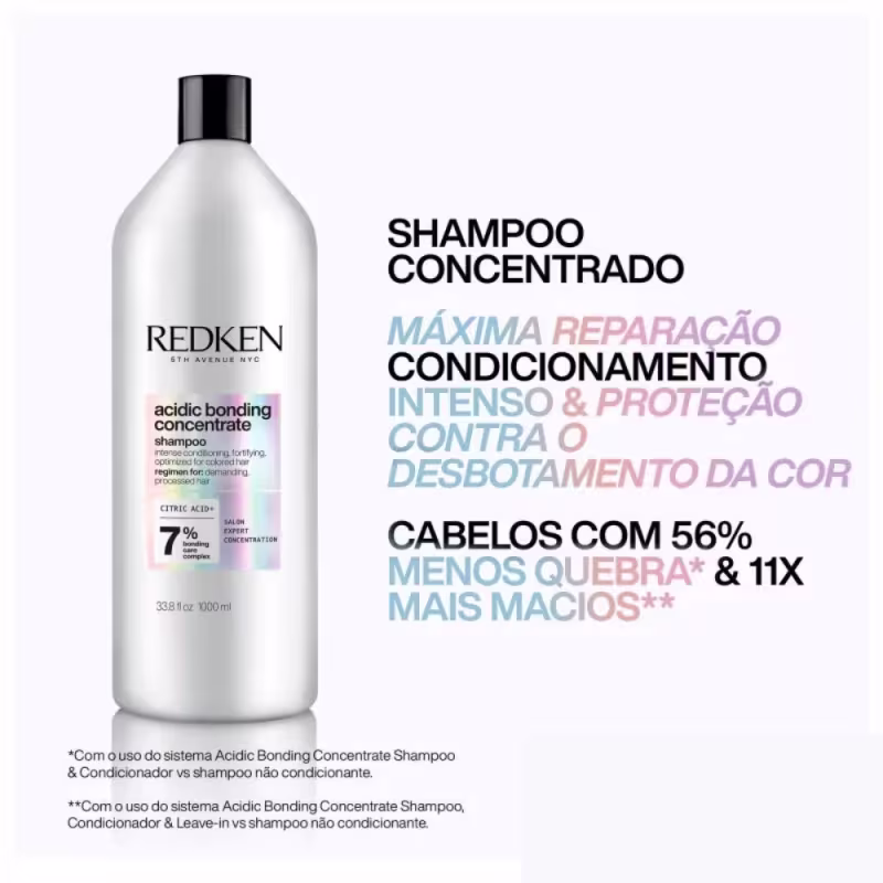 - O Shampoo Redken Acidic Bonding Concentrate é enriquecido com um sistema de reparação concentrado, desenvolvido para cabelos secos e danificados. Sua ação confere força e condicionamento intenso, além de melhorar a resistência e equilibrar o pH para um cabelo mais saudável. Em fios descoloridos, age prevenindo o desbotamento da cor.