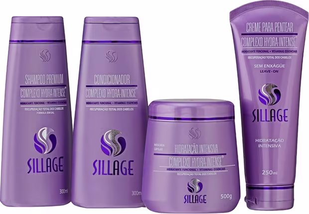Kit com Shampoo, Condicionador, Hidratação e Creme para Pentear. Kit Sillage Hydra-Intense recupera totalmente os fios danificados.