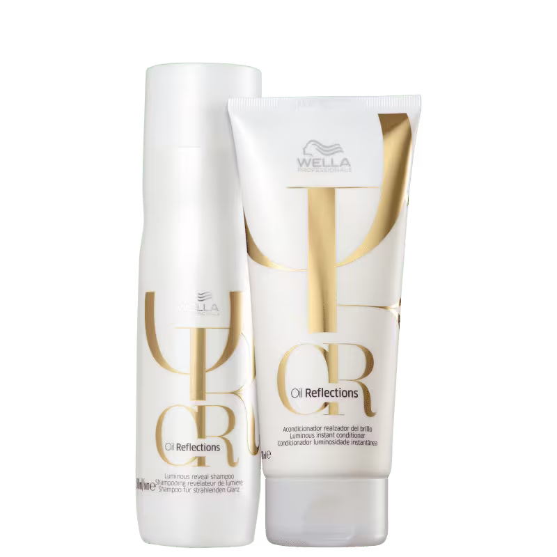 Não sei o CEPKit com shampoo e condicionador para todos os tipos de cabelos. Wella Professionals Oil Reflections Duo é um tratamento diário que ajuda a proteger a cor, promovendo um spa de maciez e luminosidade.