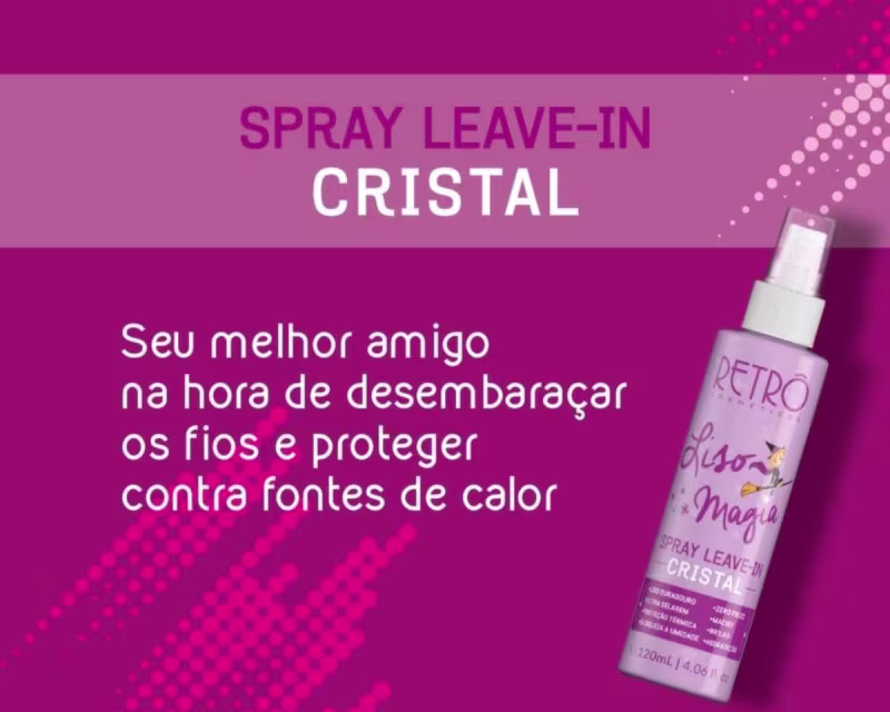 Modo de Uso: Aplique o spray leave-in Cristal Liso Magia sobre todo o comprimento do cabelo úmido. Finalize com secador e/ou prancha. Precauções: Em caso de contato com os olhos, lavá-los imediatamente com água em abundância. Manter em local fresco e fora do alcance de crianças.