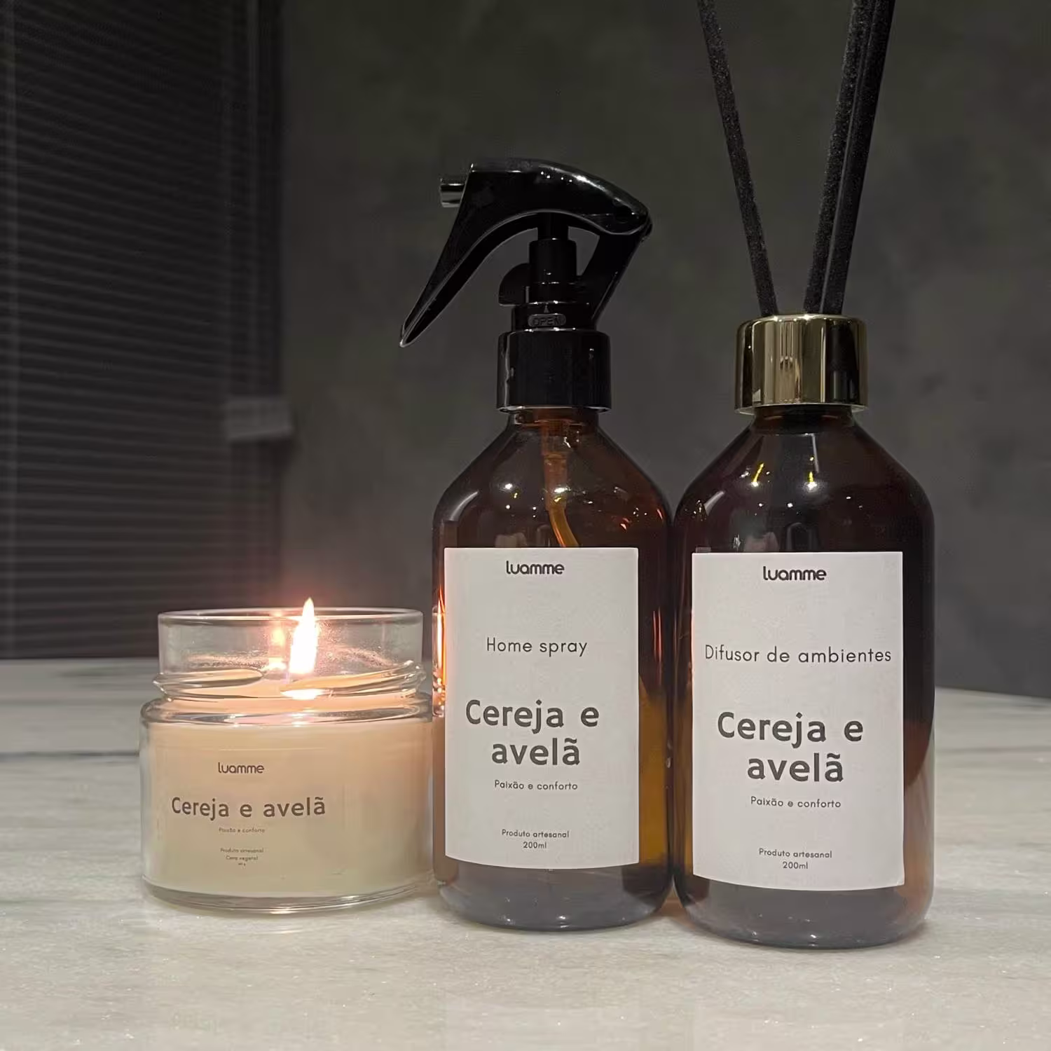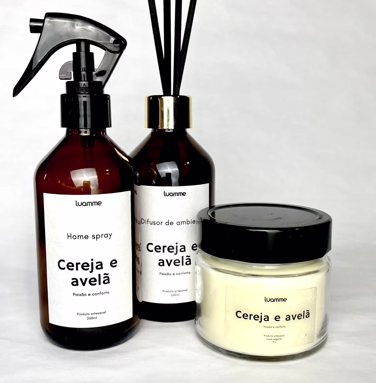 Kit Vela, Home spray e Difusor de ambientes Cereja e Avelã vidro 200ml Ver mais ❯