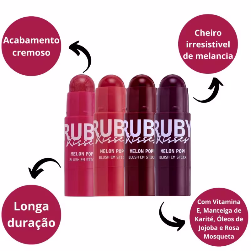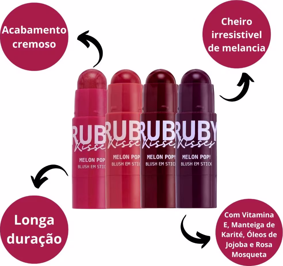 O Blush em Stick Melon Pop possui acabamento cremoso, longa duração e um cheiro irresistivel de melancia. Sua fórmula contém Vitamina E, Manteiga de Karité, Óleo de Jojoba e Óleo de Rosa Mosqueta. Fórmula vegana e não testado em animais.