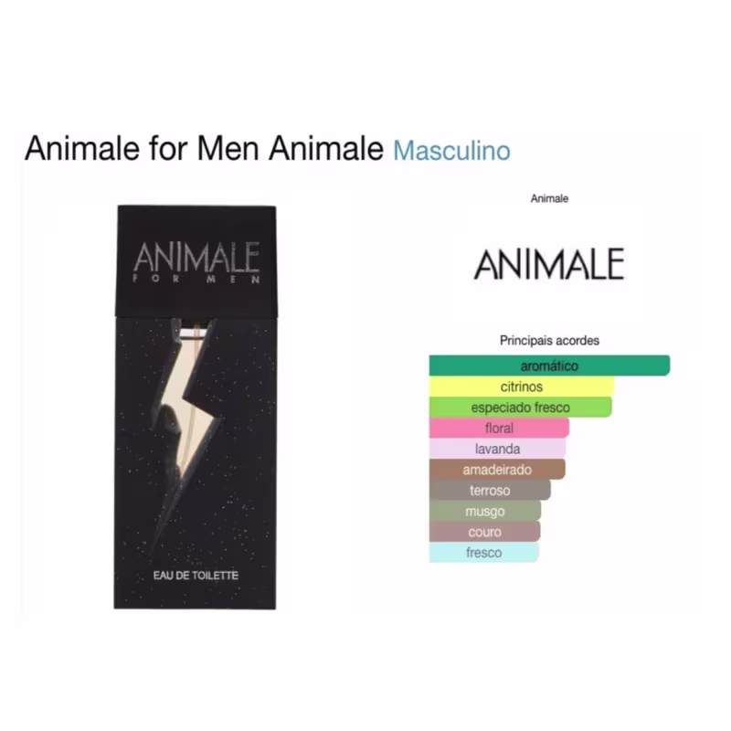 Animale for Men de Animale é um perfume Âmbar Especiado Masculino. Animale for Men foi lançado em 1993. As notas de topo são Limão, Néroli e Frésia as notas de coração são Lavanda, Bagas de Zimbro ou Junípero e Gerânio as notas de fundo são Musgo de Carvalho, Couro e Vetiver