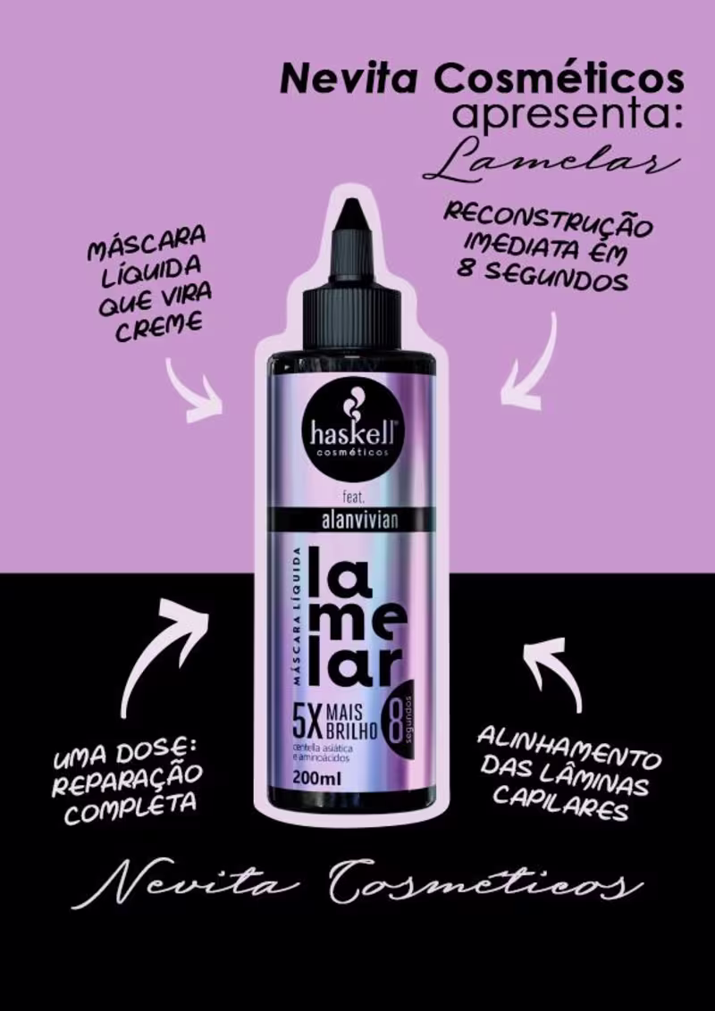 Máscara Líquida Lamelar: reconstrução intensiva e imediata, alinhamento das lâminas capilares, fios 5 vezes mais brilhantes.