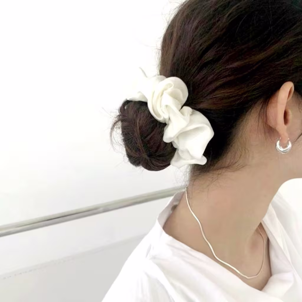 O Scrunchie de seda largo é o acessório estiloso que vai do pulso pro cabelo e vice-versa. Ele protege os fios da quebra e não marca.