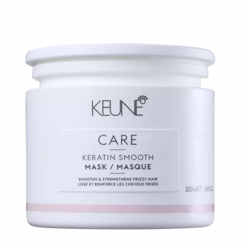 Keune Care Keratin Smooth - Máscara 200ml: máscara reparadora para o tratamento intensivo de cabelos finos, com mechas e alisamentos, Keratin Smooth Mask fortalece, hidrata, recupera a maleabilidade dos fios e realça o brilho. A tecnologia Silsoft protege e repara o cabelo do frizz, sem deixá-lo pesado.