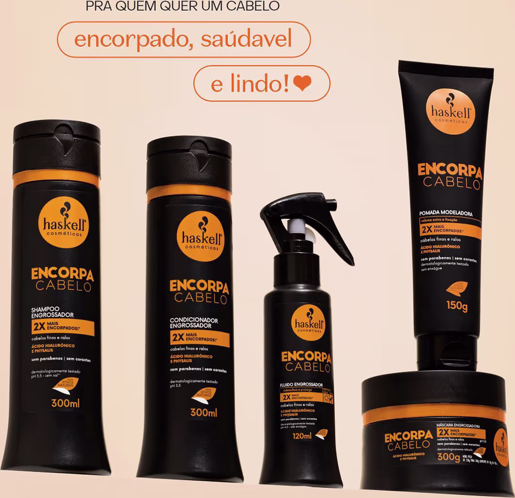 Haskell Encorpa Cabelo - Shampoo Engrossador 300ml: shampoo para cabelos finos, proporciona aumento do diâmetro dos fios, enriquecido com Ácido Hialurônico, dispõe de maravilhosas propriedades hidratantes, mantendo a maciez, o brilho e o balanço natural dos fios.