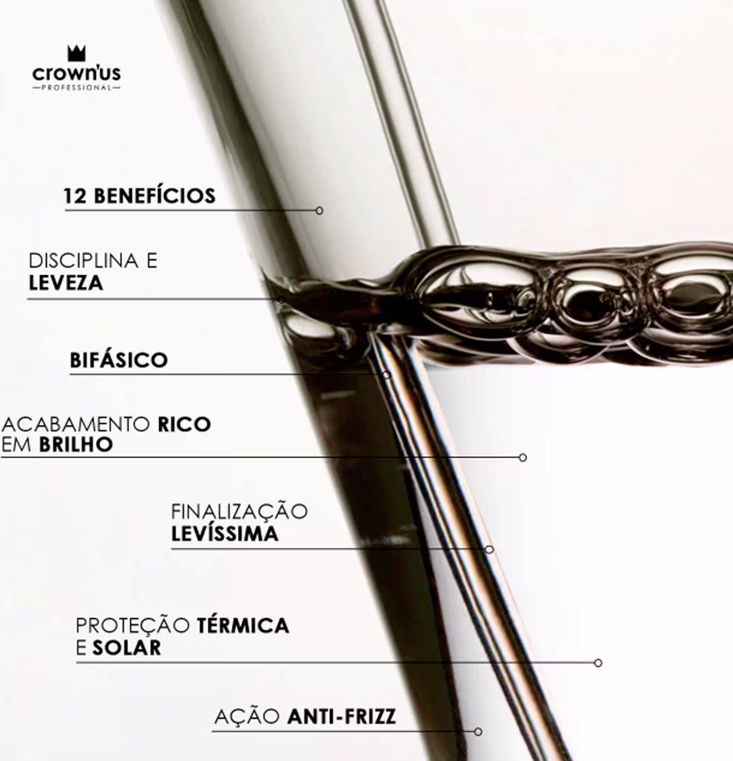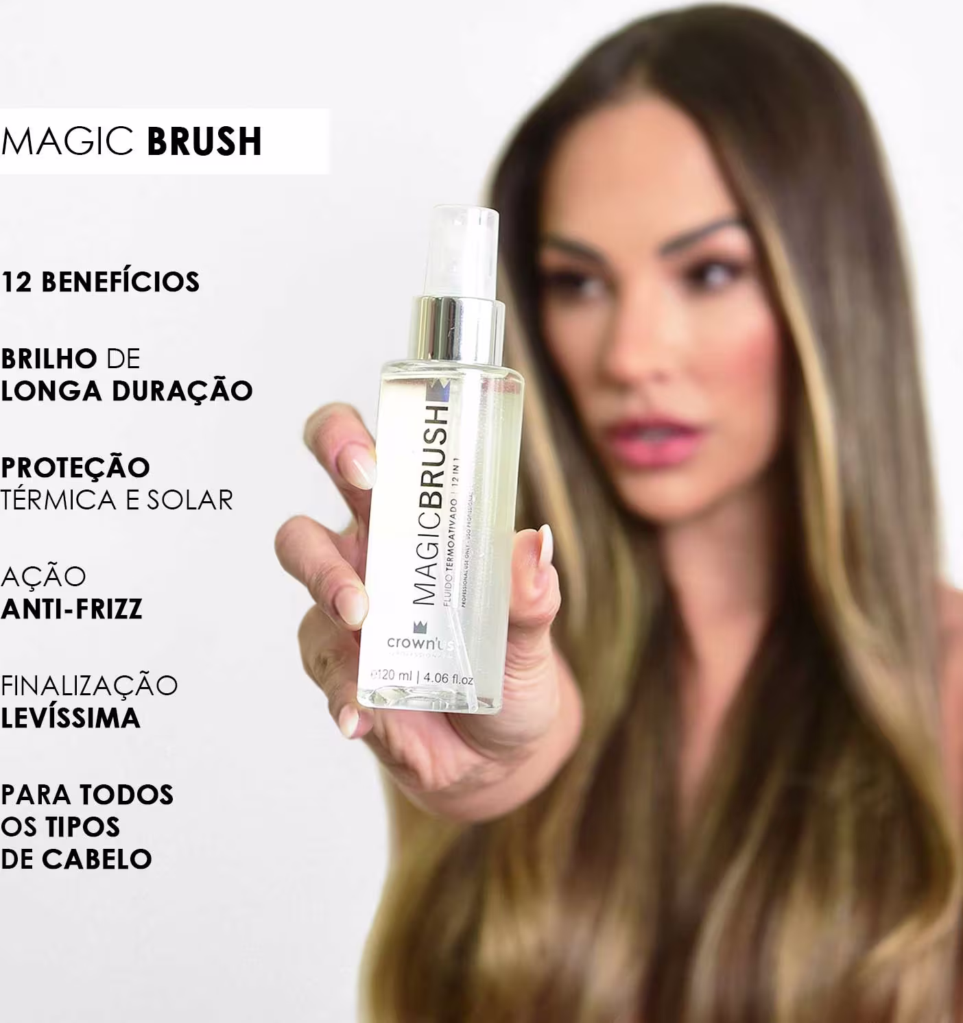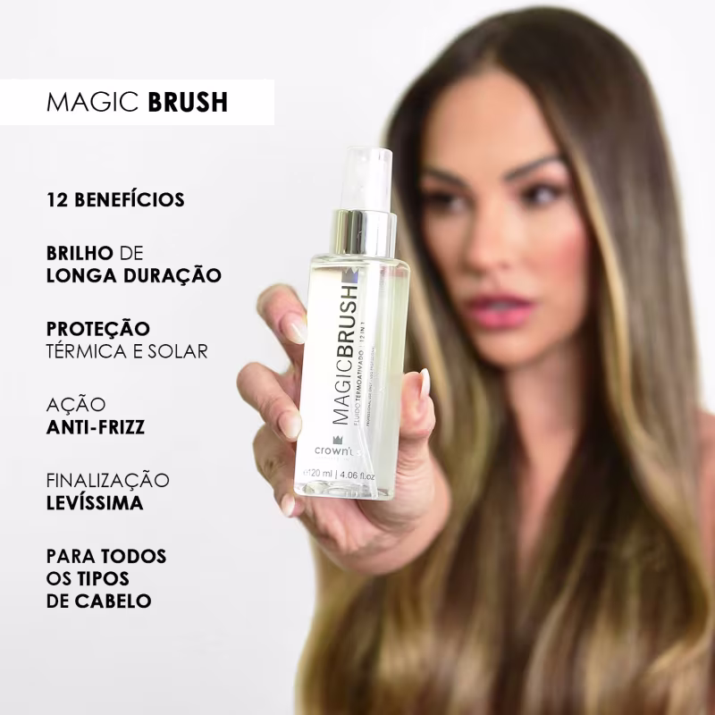 Não sei o CEPCrown’us Magic Brush é um fluido bifásico com proteção térmica para todos os tipos de cabelo, confere brilho e maciez aos fios.