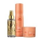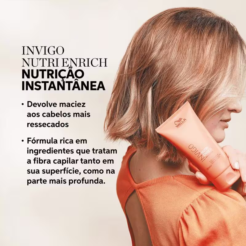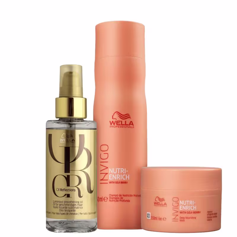 Kit de tratamento para cabelos secos, ressecados ou quimicamente tratados. Wella Professionals Invigo Nutri-Enrich oferece nutrição completa aos fios e suaviza durante o momento da lavagem.   O Kit Wella Professionals Invigo Nutri-Enrich devolve a maciez, hidratação e protege o cabelo contra danos futuros. Ideal para agir na reposição de nutrientes, restaurar a saúde dos fios e garantir brilho. Além disso, os produtos revitalizam e ajudam a disciplinar o cabelo de forma instantânea.   Este item contém Wella Professionals Invigo Nutri-Enrich - Shampoo 250ml: nutre e limpa completamente os fios, sem agredir.  Wella Professionals Invigo Nutri-Enrich - Máscara de Nutrição 150ml: trata a fibra capilar profundamente e superficialmente enquanto hidrata.  Wella Professionals Oil Reflections - Óleo Capilar 100ml: Óleo para todos os tipos de cabelos. Proporciona um efeito gloss com nutrição e proteção dos fios.  Como Usar Conselho de Aplicação Com o cabelo molhado, passe uma pequena quantidade de shampoo e massageie todo o couro cabeludo. Enxágue e repita o procedimento. Em seguida, retire o excesso de água e, com os fios úmidos, aplique a máscara pelo comprimento e pontas. Espalhe massageando mecha a mecha. Deixe agir por 5 minutos, e então, enxágue. Aplique o óleo nos fios quando desejar, comprimento e pontas.  Nossos Experts Ensinam   O ideal é aplicar a máscara nos fios úmidos, nem molhados e nem secos, pois muita água dilui os princípios ativos e o contrário não permite que eles penetrem profundamente na fibra.   Ação / Resultado  Goji Berry: uma fruta com alta concentração de vitaminas antioxidantes, minerais e peptídeos que melhoram a saúde do cabelo.  Ácido Oleico e Pantenol: proporcionam hidratação e nutrição de alta performance.  Vitamina E: protege o cabelo de danos futuros.  Óleo de Abacate e Macadâmia: nutrição instantânea e proteção dos fios.   Seu cabelo completamente nutrido e com toque sedoso.