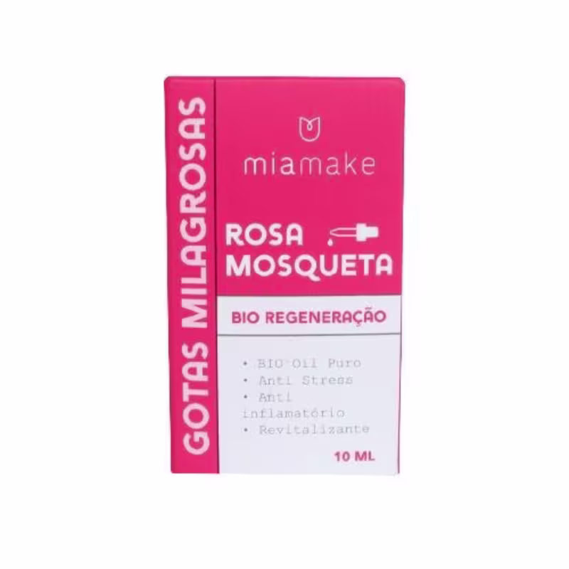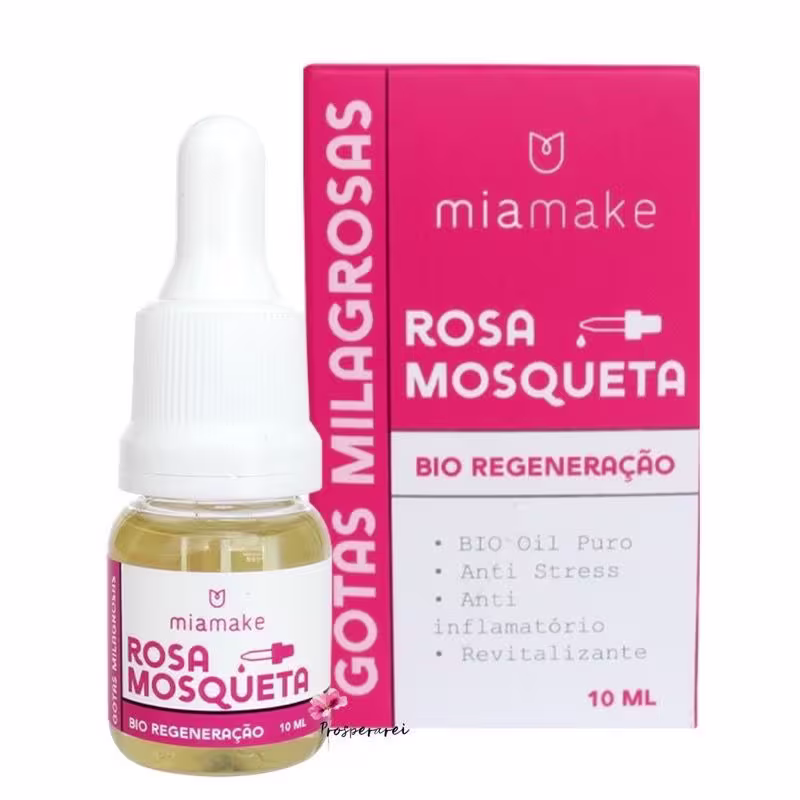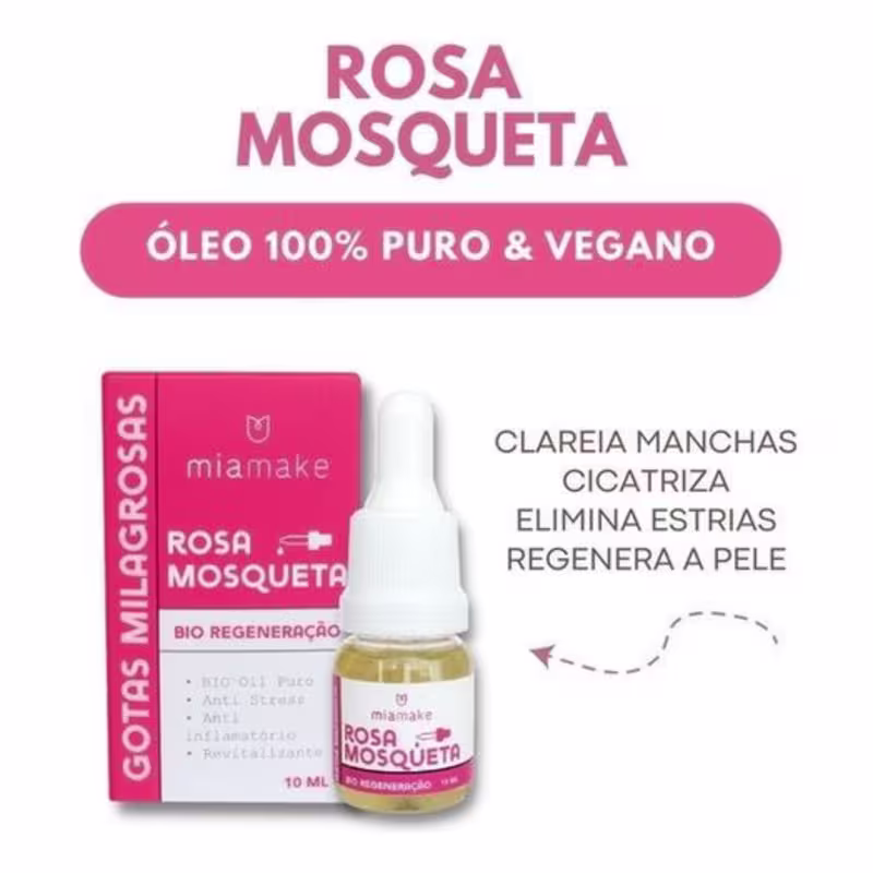 O produto Rosa Mosqueta Bio Regeneração da Mia Make é um óleo 100% puro, com efeito anti stress, uniformizador, anti inflamatório e revitalizante, também conhecido por ajudar no processo de cicatrização. O produto vem com conta gotas, que ajuda na dosagem e não desperdício do produto.