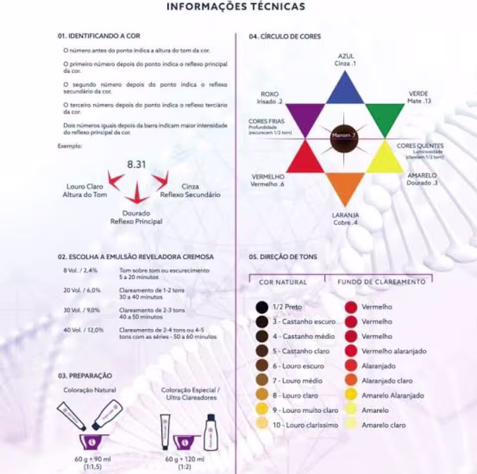 Modo de usar: A Coloração Creme Prismcolor de Richée Professional é do tipo 1 para 1 ½, ou seja, para 1 medida de coloração Prismcolor, adicione 1 medida e meia de Emulsão Reveladora Cremosa Prismcolor na volumagem adequada ao resultado desejado. Em um recipiente não metálico, coloque o conteúdo de uma bisnaga (60 g) da cor escolhida e adicione 75 ml de Emulsão Reveladora Cremosa PrismColor 20 volumes. Misture até obter um creme homogêneo. Aplique com pincel sobre os cabelos secos e não lavados. TEMPO DE PAUSA: 35 minutos.