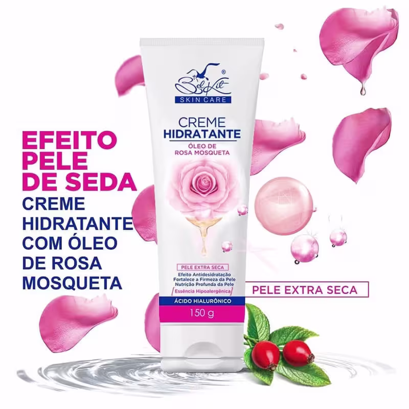 Creme Hidratante Corporal Óleo de Rosa Mosqueta Belkit enriquecido com Óleo de Rosa Mosqueta, é capaz de reforçar a síntese de colágeno e elastina, o que fortalece e dá firmeza à pele. Também é responsável por nutrir profundamente a pele, o que o torna ideal para pele extra seca, deixando-a suave e sedosa.