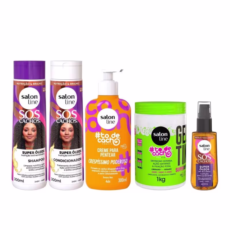 O Kit contém 1 Shampoo e Condicionador SOS Cachos Super Óleos, 1 Creme Para Pentear #todecacho Crespíssimo Poderoso, 1 Gelatina #todecacho Super Definição e 1 Óleo Sos Cachos Super Óleos. O kit promove nutrição, limpeza e brilho além de definição intensa.