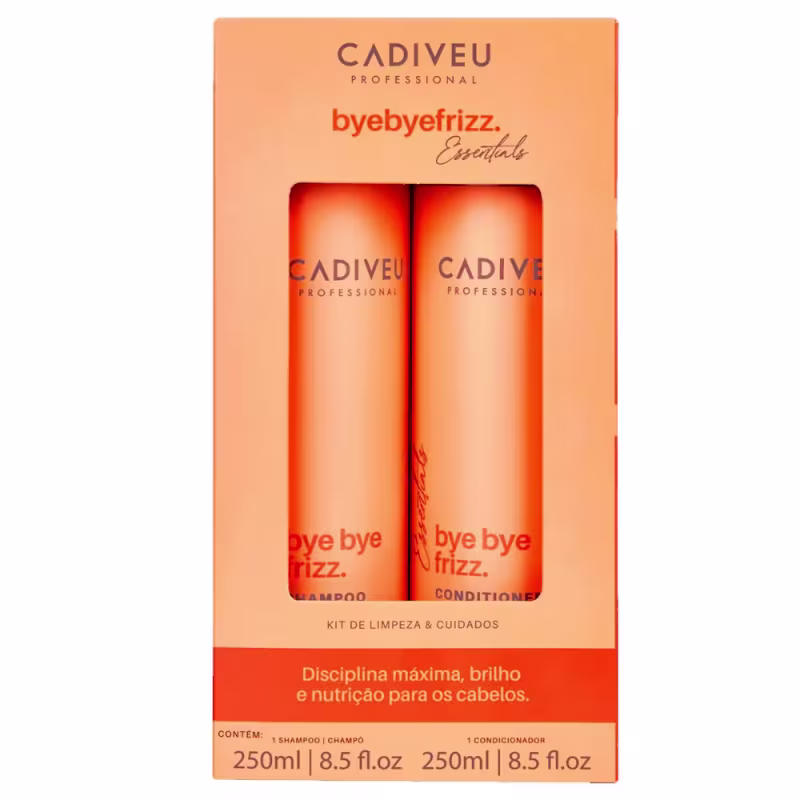 Kit com shampoo e condicionador. Kit Cadiveu Essentials Bye Bye Frizz entrega disciplina máxima, nutrição intensa e brilho para o cabelo.