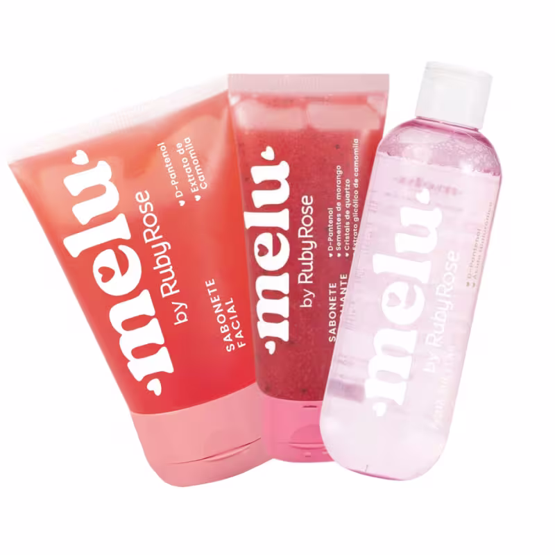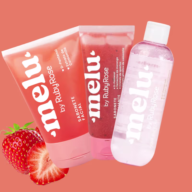 Cuide bem da sua pele com o Kit Sabonetes Faciais MORANGO e Água Micelar Melu, composto por 3 produtos incríveis para uma rotina de skincare perfeita.