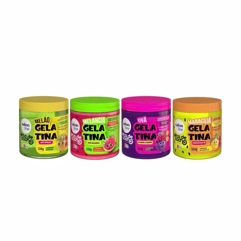 O kit conta com 4 gelatinas com cheirinho de frutas, formando o combo perfeito para a finalização dos cabelos dos pequenos. Juntos são especialmente formulados para cuidar dos fios delicados, oferecendo hidratação, definição e controle do frizz.