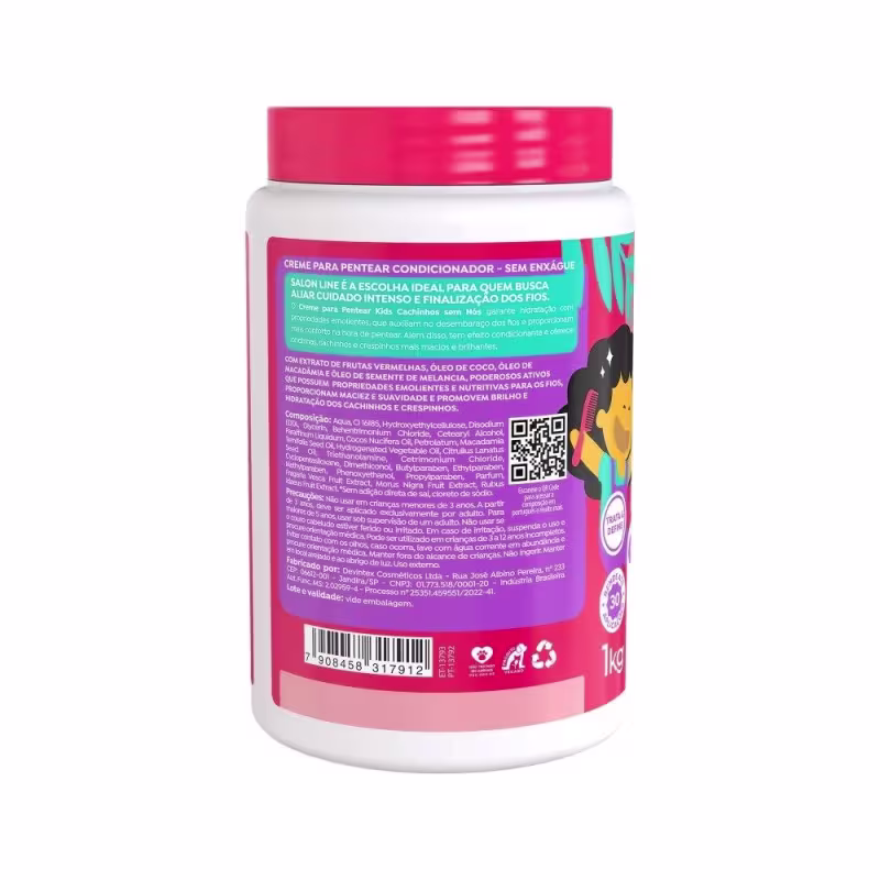 Óleo de coco: poderoso ativo hidratante para os cabelos que proporciona maciez e suavidade aos cachinhos das crianças. Óleo de macadâmia: promove brilho e hidratação dos cachinhos. Óleo de semente de melancia: auxilia na nutrição e maciez dos fios. Extrato de frutas vermelhas: possui propriedades emolientes e nutritivas para os cabelos.