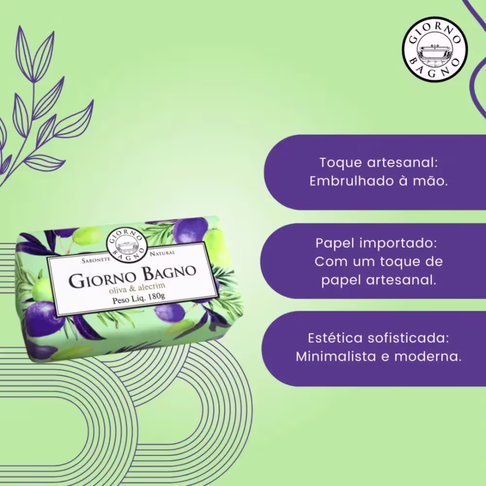 Com uma fórmula rica em ingredientes naturais, o Sabonete Giorno Bagno Oliva e Alecrim limpa suavemente a pele, removendo as impurezas sem agredi-la. O azeite de oliva, conhecido por suas propriedades emolientes, hidrata a pele, deixando-a macia e aveludada. O alecrim, por sua vez, tonifica e refresca a pele.