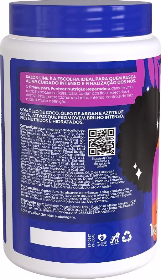 Creme para Pentear Nutrição Reparadora Óleo de coco: fortalece os fios e proporciona brilho e maciez extrema. Óleo de argan: promove hidratação e nutrição, reparando e fortalecendo os cabelos. Azeite de oliva orgânico: hidrata e dá brilho ao cabelo, além de nutrir e regenerar os fios.