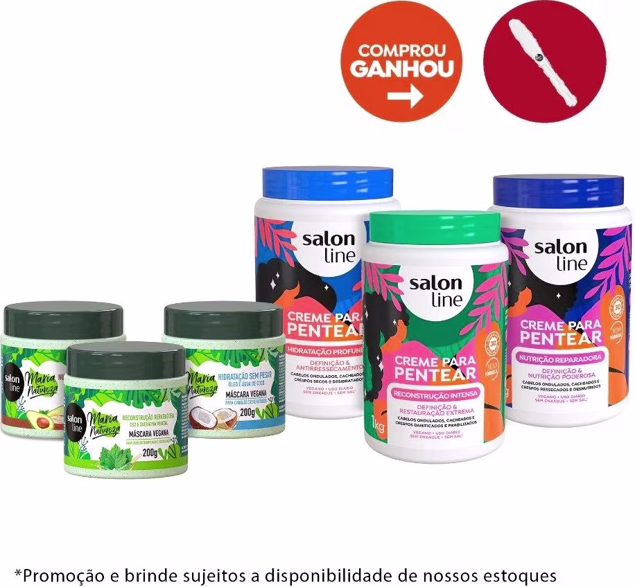 O Kit Salon Line conta com conta 1 Máscara Maria Natureza Hidratação sem Pesar Óleo e Água de Coco, 1 Máscara de Hidratação Maria Natureza Nutrição Extraordinária Murumuru e Abacate, 1 Máscara de Hidratação Maria Natureza Reconstrução Reparadora, 1 Creme para Pentear Hidratação Profunda, 1 Creme para Pentear Reconstrução Intensa e 1 Creme para Pentear Nutrição Reparadora.
