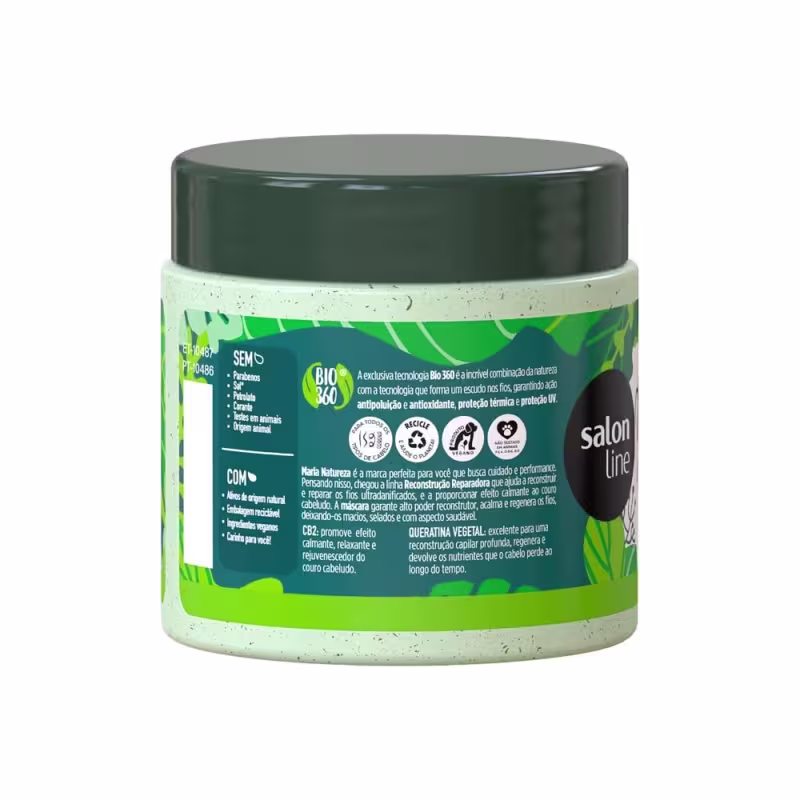 Máscara de Hidratação Maria Natureza Reconstrução Reparadora CB2: possui efeito calmante, relaxante e rejuvenescedor para o couro cabeludo. Queratina vegetal: excelente para uma reconstrução capilar profunda, regenera e devolve os nutrientes que o cabelo perde ao longo do tempo.