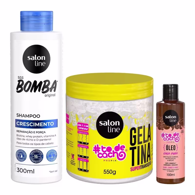 O kit contém os produtos ideais para a transição capilar: o Shampoo S.O.S Bomba Original, o Óleo de Umectação #todecacho Coco Puro e a Gelatina #todecacho Super Transição que garantem crescimento capilar rápido e saudável, além de nutrir e ajudar a definir os cachos.