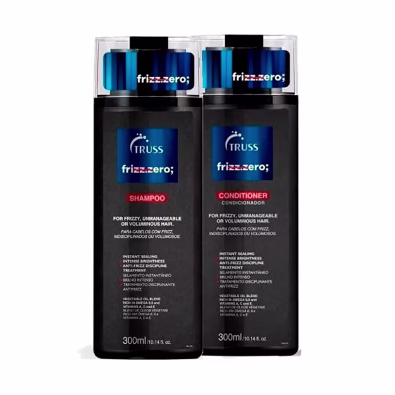 Não sei o CEPKit Frizz Zero Truss - Shampoo 300ml + Condicionador 300ml Kit com shampoo e condicionador para cabelos com frizz. Truss Frizz Zero Home Care Duo sela as cutículas, além de garantir brilho. O Kit Truss Frizz Zero Home Care Duo age rapidamente nos fios, disciplinando e alinhando a superfície capilar, reduzindo o frizz e o volume, conferindo resultados rápidos e impecáveis. Contém: Truss Frizz Zero - Shampoo 300ml: proporciona um tratamento de qualidade e excelência contra o frizz, limpando os fios, sem agredir, enquanto alinha a superfície capilar. Truss Frizz Zero - Condicionador 300ml: desembaraça e condiciona os fios, alinhando os cabelos e reduzindo o volume.