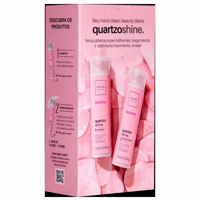 Kit com shampoo e condicionador para cabelos secos e opacos. O Kit Homecare Cadiveu Essentials Quartzo Shine é um tratamento diário poderoso para o hair care, limpando sem ressecar e condicionando sem pesar. Também aumenta a maciez e facilita o desembaraço e combate o ressecamento e garante brilho intenso, graças a sua formulação que promove a nutrição suave dos fios e sua textura leve que proporciona leveza e movimento.