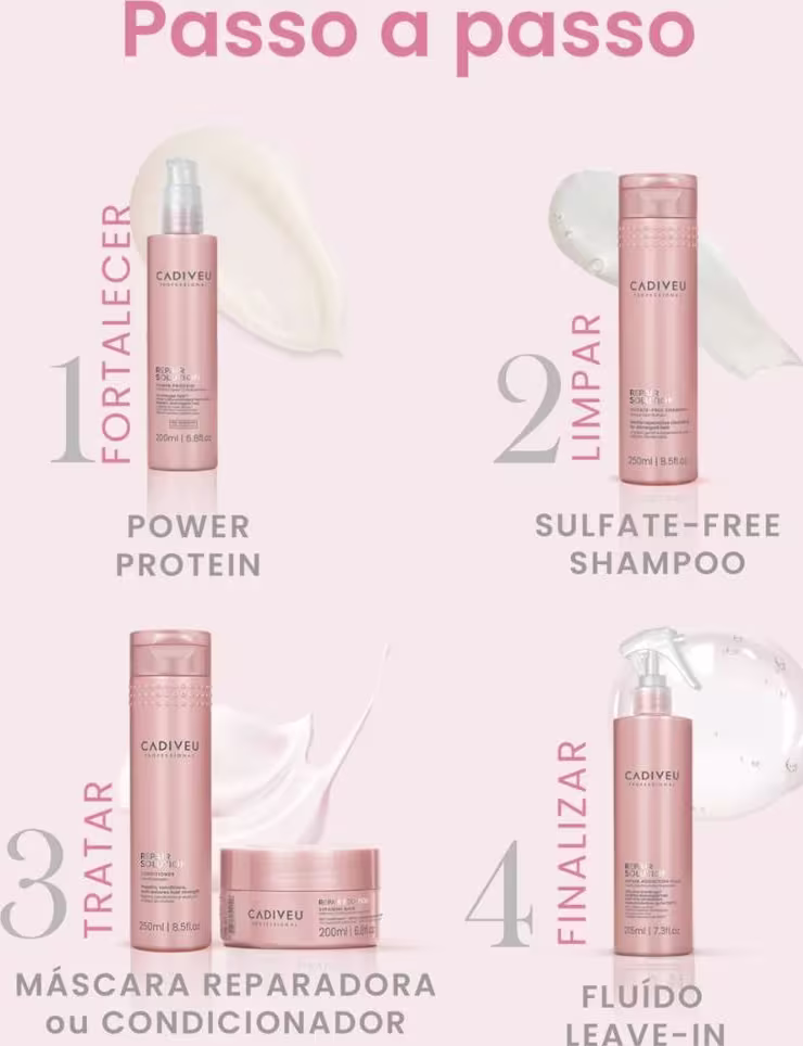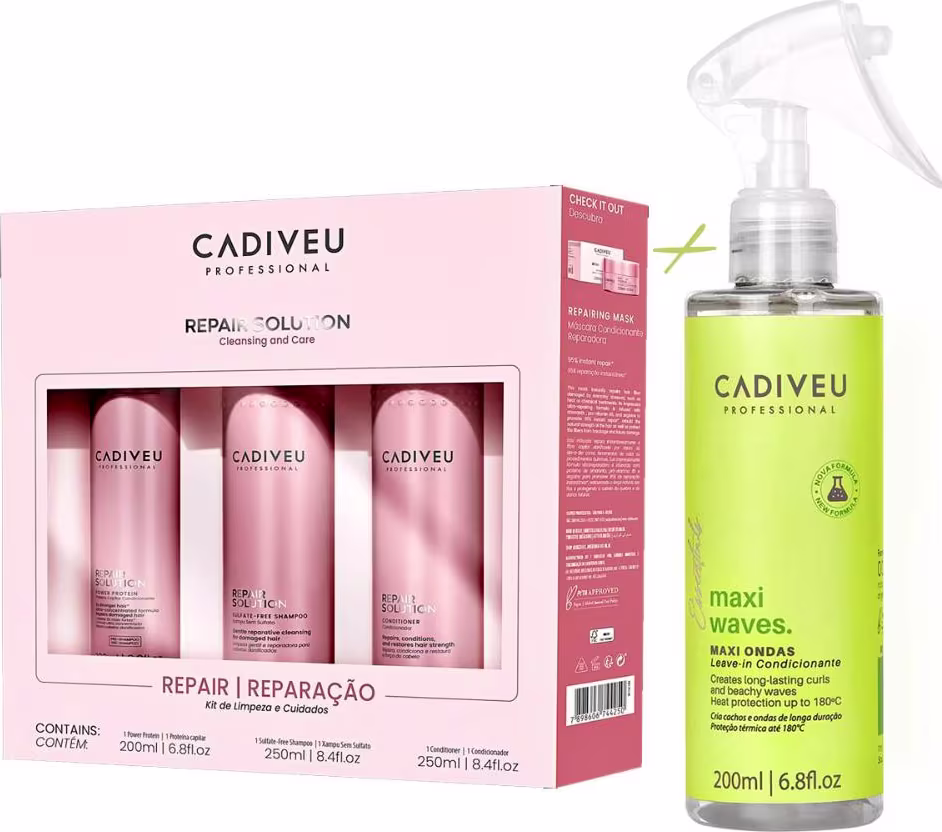 O Kit Cadiveu Professional Repair Solution Reparação conta com pré-shampoo, shampoo e condicionador que promovem a recuperação dos danos causados por processos mecânicos, térmicos ou químicos.