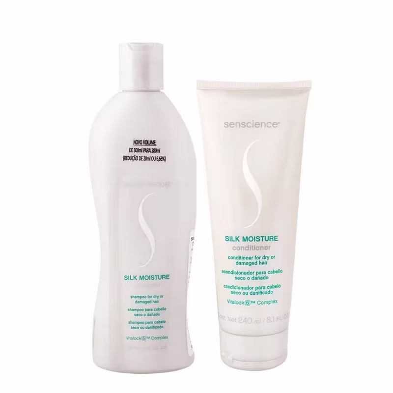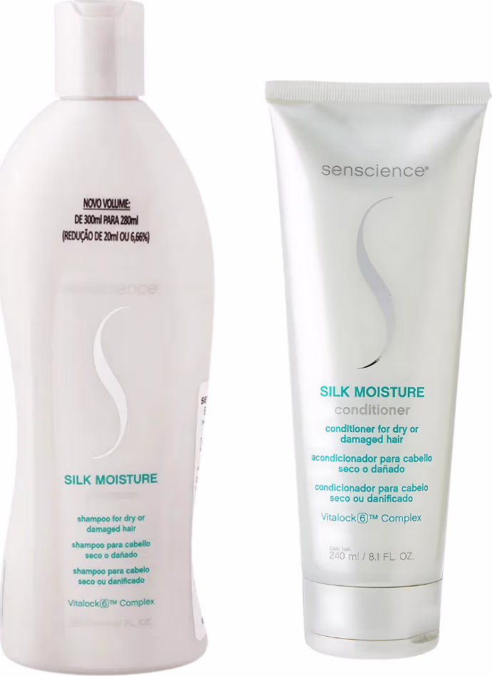 Kit de tratamento para cabelos secos e danificados. Senscience Silk Moisture limpa gentilmente, desembaraça e condiciona, hidratando e proporcionando maciez aos fios.