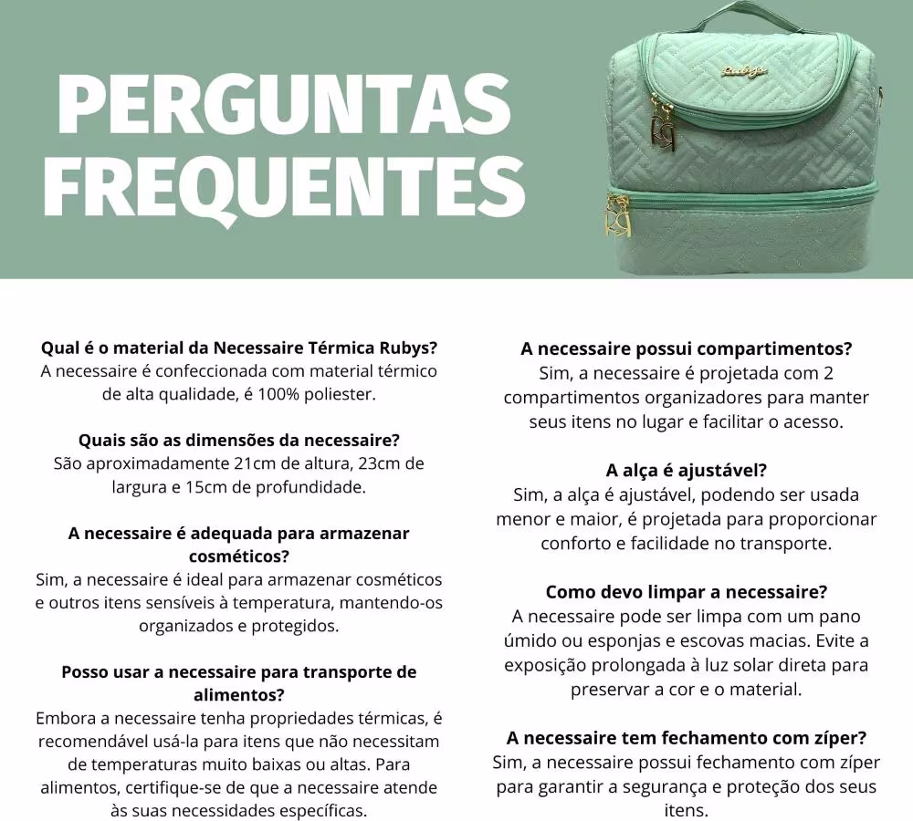 A Necessaire Térmica Rubys com Alça na elegante cor Verde Claro é a escolha perfeita para quem valoriza praticidade e estilo. Ideal para manter seus itens essenciais organizados e protegidos, esta necessaire é perfeita para viagens, trabalho ou uso diário. Confeccionada com material térmico de alta qualidade, a necessaire mantém a temperatura dos seus produtos por mais tempo, garantindo que itens como cosméticos e medicamentos estejam sempre na temperatura ideal. Equipado com uma alça confortável, facilita o transporte e a mobilidade, permitindo que você leve sua necessaire com facilidade aonde for.