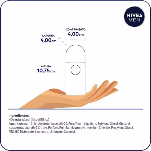 Não inclui Álcool (Álcool Etílico), Corantes, Conservantes Aqua, Aluminum Chlorohydrate, Isoceteth-20, Paraffinum Liquidum, Butylene Glycol, Glyceryl Isostearate, Laureth-7 Citrate, Parfum, Palmitamidopropyltrimonium Chloride, Propylene Glycol, PEG-150 Distearate, Linalool, Limonene, Geraniol