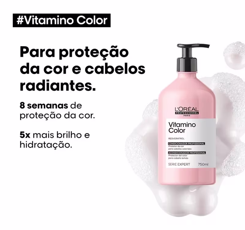 O Condicionador Vitamino Color foi desenvolvido especialmente para esse tipo de cabelo! Ele promove a com proteção até das cores mais sensíveis, hidratação e luminosidade para os fios. Para a proteção da cor e cabelos radiantes. Seu principal ingrediente, o Resveratrol, é um poderoso antioxidante presente na casca e nas sementes das uvas, que tem a função de preservar a cor dos cabelos. O resultado após o uso é um cabelo 8 semanas de proteção da cor e 7x mais brilho. Tecnologia: RESVERATROL: Tecnologia rica em polifenóis. Poderoso antioxidante presente na casca e nas sementes das uvas, que tem a função de preservar a cor dos cabelos. MODO DE USO