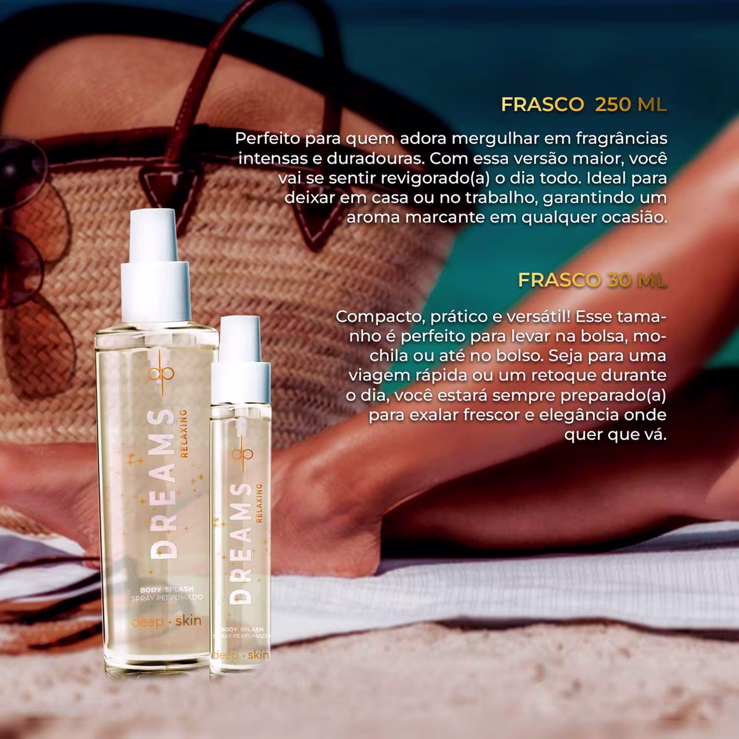 Alívio de Estresse: As fragrâncias calmantes presentes em Dreams atuam na redução dos níveis de estresse. Ao utilizar este body splash, você experimenta um alívio imediato das tensões, proporcionando uma sensação geral de bem-estar e tranquilidade. Ambiente Relaxante: Ao criar um ambiente relaxante e propício ao descanso, Dreams contribui significativamente para uma noite tranquila e reparadora. As notas aromáticas trabalham em sinergia para acalmar a mente, facilitando a transição para um estado de calma e meditação. Elevação do Humor: A combinação de fragrâncias agradáveis e reconfortantes tem um impacto positivo no humor, ajudando a combater sentimentos de ansiedade, promovendo uma sensação de calma e contentamento que pode perdurar ao longo do dia. Hidratação da Pele: Além de oferecer uma fragrância deliciosa, Dreams também ajuda a hidratar e suavizar a pele. Sua fórmula leve e não oleosa é ideal para uso diário, mantendo a pele macia e perfumada.Frasco de 250 ml e 30 ml