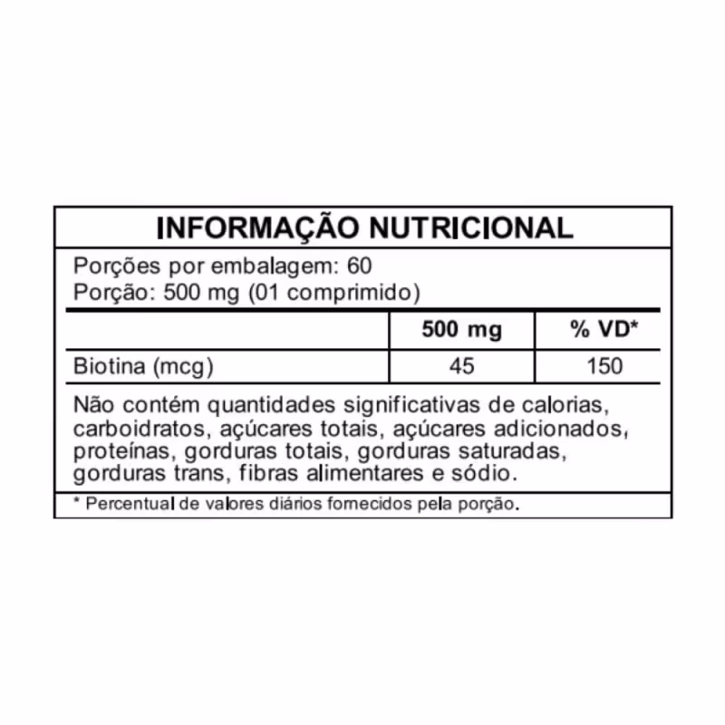 Recomendações de UsoPara usufruir de todos os benefícios da Vitamina B7 Biotina, basta consumir 01 (um) comprimido por dia. Indicado para o grupo populacional com idade igual ou superior a 19 anos, cada embalagem contém 60 comprimidos de 500mg, garantindo um suprimento adequado para um mês de uso regular.