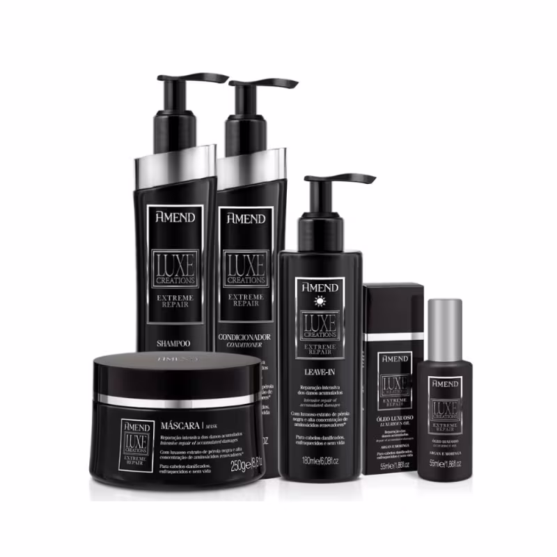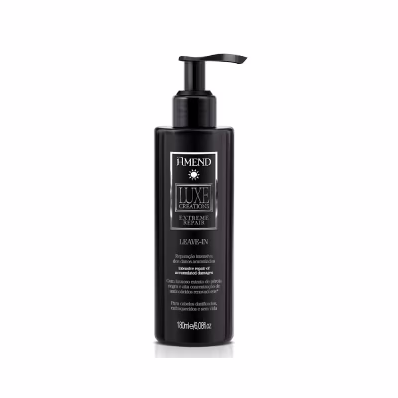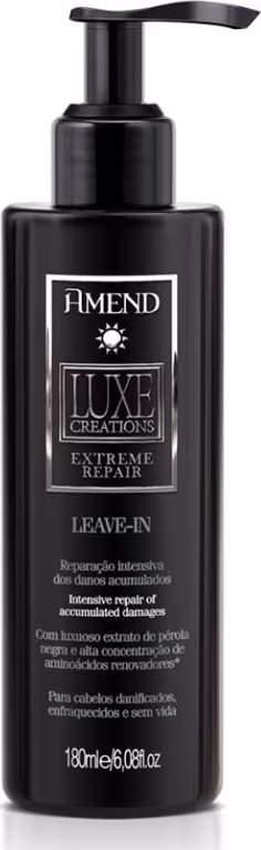 O Leave-in Amend Luxe Creations Extreme Repair possui ação termoativada que protege os fios do calor durante a escovação facilitando a secagem. Contém filtro solar. Elaborado com alta concentração de ativos que combatem os sinais de envelhecimento capilar (cabelos opacos, fracos e desidratados), evitam o desbotamento da cor e recuperam rapidamente os fios mantendo-os hidratados, fortes, brilhantes e disciplinados.