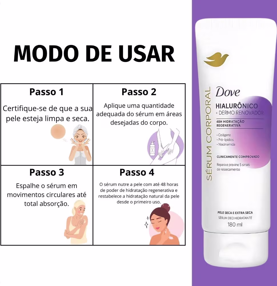 - 03 Sérum Corporal Hidratante Dove Hialurônico + Dermo Renovador 180ml