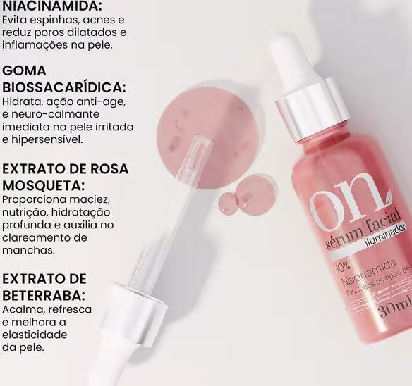 O Sérum Facial Iluminador ON é um produto que associa ativos que cuidam da pele deixando-a mais hidratada, protegida e uniforme. Ideal para todos os tipos de pele, especialmente as mais oleosas e sensíveis. Possui 10% de Niacinamida.