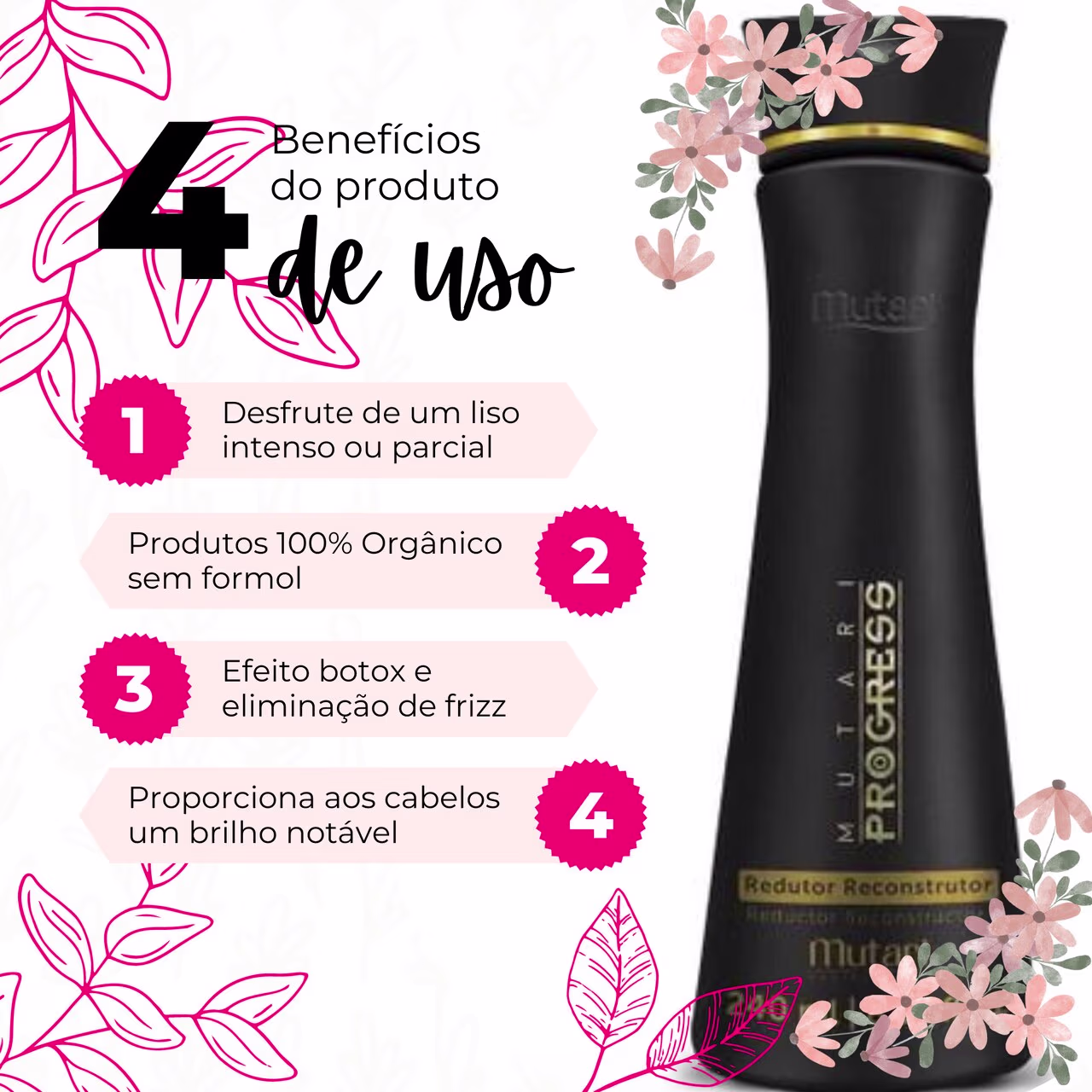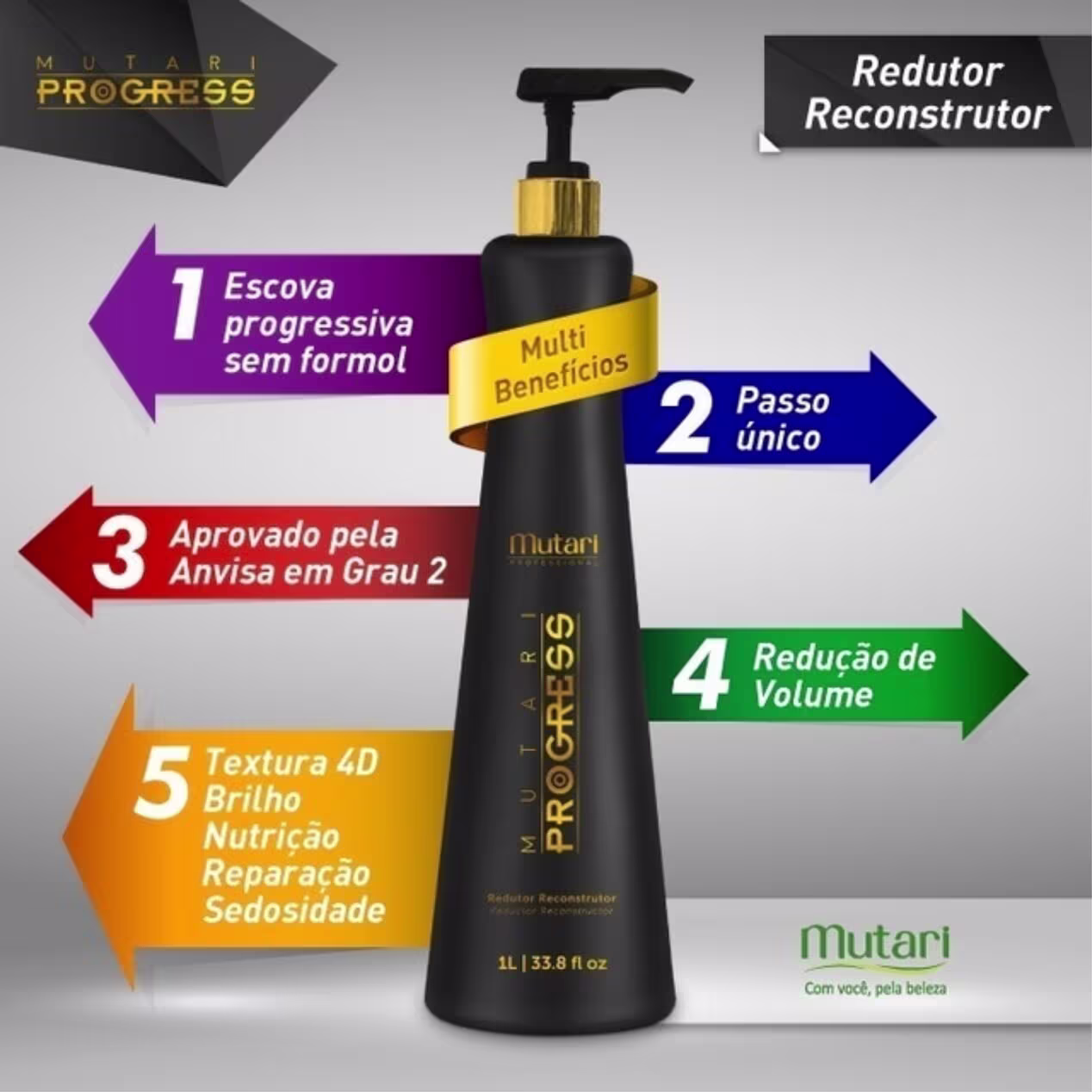 Procurando uma progressiva que promova tratamento durante o processo da transformação Que diminua a agressão da química nos fios O Redutor Reconstrutor Mutari Progress 1L é a solução Sua fórmula enriquecida com ativos de alta performance ácido hialurônico extrato de bambu bio ester de manteiga de karité e queratina hidrolisada garante fios saudáveis e com muito brilho Muito versátil o Redutor Mutari Progress possibilita realizar quatro procedimentos com resultados diferentes como por exemplo alisar totalmente abertura de cachos efeito BTX ou eliminar o frizz Ideal para atender às necessidades dos clientes de forma prática rápida segura e com desempenho elevado Ficou interessada Confira abaixo mais informações sobre esse produto inovador