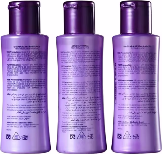 Passo 2) Ativo: Aplicar nos cabelos secos, mecha a mecha, secar e pranchar. Enxaguar com água em abundância.