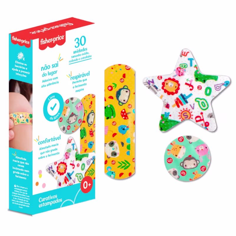 Os curativos estampados Fisher Price, descartáveis e de alta qualidade oferecem proteção contra possíveis infecções de ferimentos e machucados.Material respirável e livre de látex, minimiza reações alérgicas, afasta sujeiras, germes e bactérias contribuindo para uma cicatrização eficaz.