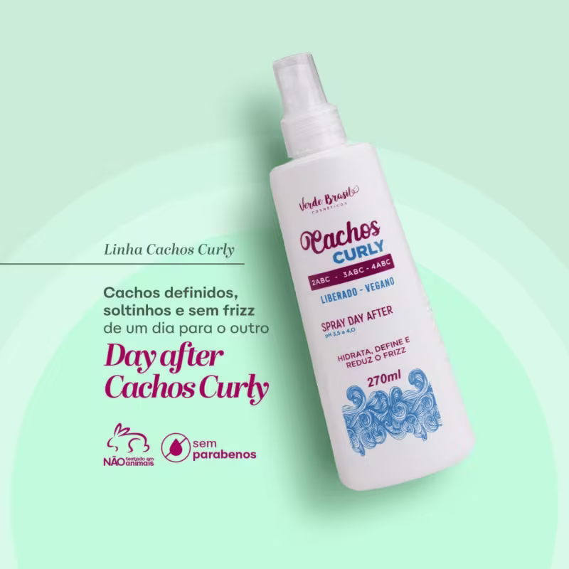 O Spray Day After Cachos Curly da Verde Brasil Cosméticos, é indicado para cabelos crespos, cacheados 2ABC – 3ABC – 4ABC. Promove revitalização instantânea, brilho e reduz o frizz dos cabelos. É a solução perfeita para manter os cabelos bonitos e bem definidos entre uma lavagem e outra. Mantém a beleza natural dos cabelos, sem trazer um aspecto "pesado".