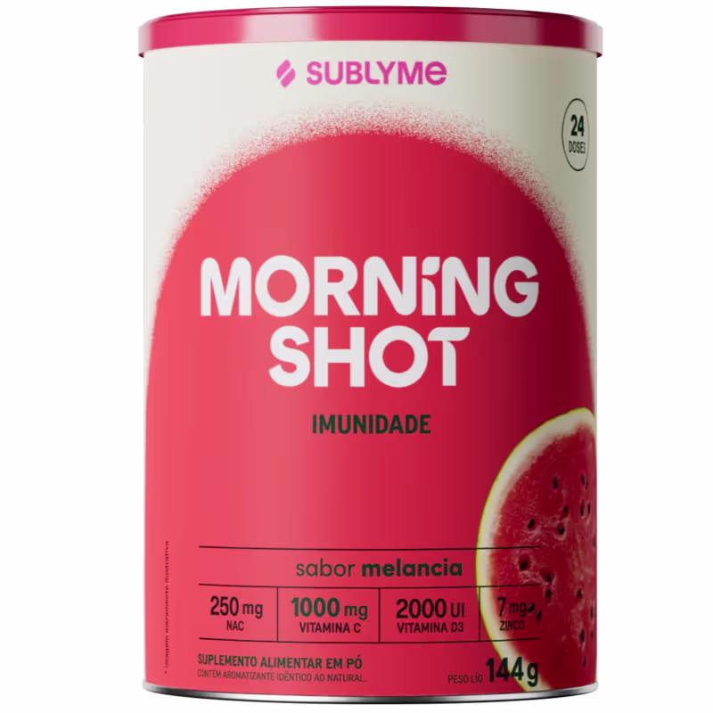 Morning Shot Melancia DESCRIÇÃO: O Morning Shot é um suplemento alimentar instantâneo (solúvel em água) de fácil preparo, além de conter uma variedade de aminoácidos, vitaminas, minerais e substâncias bioativas. Produzir um shot matinal parecido de forma caseira seria pouco prático e muito custoso, o que dificultaria - e muito - a manutenção do hábito de consumi-lo diariamente. O Morning Shot é o seu aliado para uma boa rotina matinal, combina de forma estratégica e cuidadosa a quantidade dos seus ingredientes, buscando oferecer uma suplementação de vitaminas e minerais no início do seu dia, sem abrir mão da melhor experiência para o seu paladar. Com o melhor custo benefício o Morning Shot, você economiza mais 50% em comparação com a compra dos suplementos individuais Cada dose têm a quantidade ideal de ingredientes, dentro dos limites seguros recomendados pela Anvisa. O Morning Shot é um shot matinal para suplementar a alimentação ao longo do dia. Sua fórmula é repleta de vitaminas, nutrientes e minerais, selecionados por profissionais de saúde. A vitamina C, a vitamina D, o selênio e o zinco auxiliam no funcionamento do sistema imune. Além deles, o Morning Shot contém outros ativos com diversos benefícios, são eles: vitamina E, glutamina, NAC, vinagre de maçã em pó, beta glucana, extrato de própolis, glicina, gengibre, pimenta preta e limão em pó. O Morning Shot é uma ótima maneira de quebrar o jejum calórico, pois tem apenas 11kcal em cada dose (6g) e possui uma fórmula sem açúcar, sem lactose e rica em vitaminas e minerais. Além disso, não quebra o jejum metabólico (também conhecido como insulínico), pois não tem quantidades suficientes de macronutrientes para tanto. MARCA: SUBLYME SABOR: Melancia INGREDIENTES: Melancia - Vinagre de maçã em pó, L-Glutamina, Ácido ascórbico (Vitamina C), Glicina, Polpa de limão em pó, Tangerina em pó, Beta-glucana de levedura (Saccharomyces cerevisiae), N-Acetil L-Cisteína, Gengibre em pó, Extrato de Rizomas de Cúrcuma longa, Cúrcuma em pó, Beterraba em pó, Extrato de Própolis, Pimenta Preta em pó, Acetato de DL-alfa-tocoferol (Vitamina E), Bisglicinato de Zinco (Zinco), Vitamina D3 (Colecalciferol), Selenito de sódio (Selênio), Acidulante Ácido Cítrico, Aromatizantes, Edulcorante Glicosídeos de Esteviol de Stevia rebaudiana Bertoni e Antiumectante Dióxido de Silício INDICADO: Recomenda-se o consumo por pessoas com 19 anos ou mais, desde que não haja histórico de alergias ou hipersensibilidade a algum dos componentes da fórmula. O Morning Shot não deve ser consumido por gestantes, lactantes e crianças. Com 2.000 UI de Vitamina D por dose, o Morning Shot é um produto fonte de vitamina D. A vitamina D, além de auxiliar no sistema imune, auxilia no funcionamento muscular, na formação de ossos e na absorção de cálcio e fósforo. O Morning Shot tem alto teor de vitamina E. A vitamina E é um antioxidante que auxilia na proteção dos danos causados pelos radicais livres. O selênio é um micronutriente essencial e muitos estudos já demonstraram a sua importância para o ser humano devido às suas propriedades antioxidantes, neuro e cardioprotetoras e anti-inflamatórias. O selênio exerce suas funções através das selenoproteínas, a mais conhecida selenoproteína é a glutationa peroxidase, uma enzima antioxidante, que remove os hidroperóxidos lipídicos mantendo assim a integridade das membranas. Imunidade, O morning shot é uma bebida que suplementa a alimentação, sendo fonte de selênio e alto conteúdo em zinco e vitaminas C e D, constituintes que auxiliam no funcionamento do sistema imune. Ação antioxidante, O Morning Shot contém 1000 mg de vitamina C por porção. A vitamina C auxilia no funcionamento do sistema imune, além de auxiliar na proteção dos danos causados pelos radicais livres. A vitamina C também auxilia no metabolismo energético e no metabolismo de proteínas e gorduras, além de auxiliar na formação de colágeno e na absorção de ferro dos alimentos. MODO DE PREPARO: Para 80ml de água adicionar 1 dosador, 6G, de morning shot. EMBALAGEM: lata com 144G APRESENTAÇÃO: Limão: o sabor intenso do limão, com notas de especiarias; Tangerina: o equilíbrio entre o cítrico e o dulçor da tangerina com um toque de especiarias; Melancia: o dulçor da melancia com um leve toque cítrico. TABELA NUTRICIONAL: Quantidade baixa de carboidratos enquadra o SuperCoffee como um produto Low Carb. Zero açúcar. Adoçado naturalmente com Stevia. Gordura boa/saudável proveniente dos Triglicerídios de Cadeia Média presentes na fórmula (TCM). Presença completa de todas Vitaminas do Complexo B. Ácido Clorogênico equivalente ao Café Verde descrito na parte frontal do rótulo. Não qualquer Cafeína. Cafeína Microencapsulada. Dosagem recomendada por profissionais de saúde. Um dos mais potentes antioxidantes.