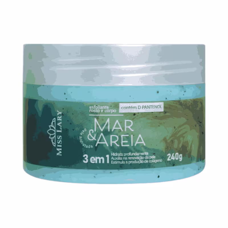 O Esfoliante corpo e rosto Mar & Areia da Miss Lary é rico em Extrato de Algas Marinhas e Óleo de Amendoas, que possuem ação remineralizante, suavizante e hidratante. Confere melhora na textura da pele e estimula a produção de colágeno. É enriquecido com o D pantenol que auxilia na renovação da pele e ainda conta com a ação antioxidante da Vitamina E. Uso corporal e facial.
