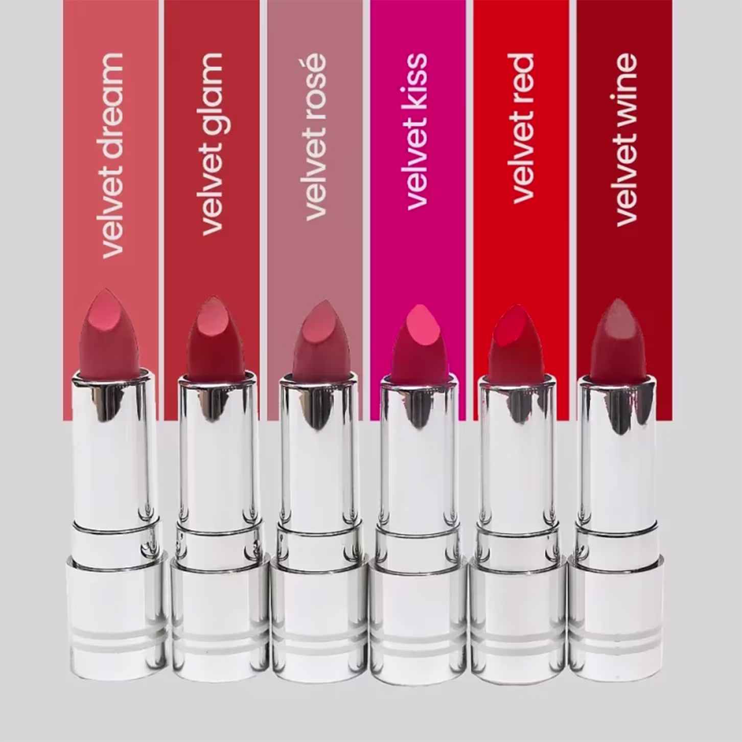 São 6 cores icônicas, variando desde o nude mais claro até o vermelho mais escuro.