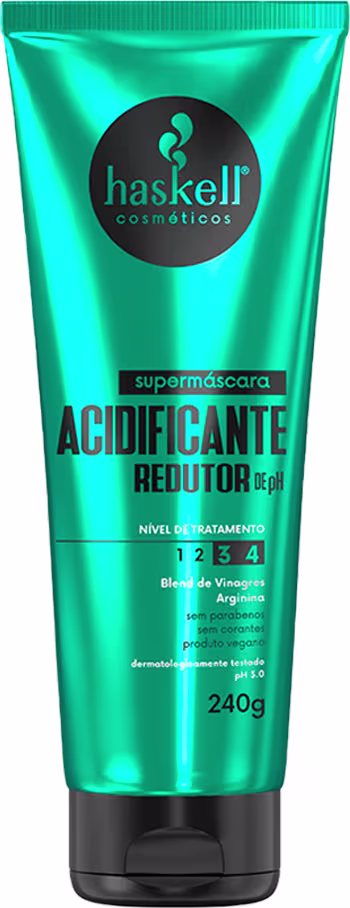 Supermáscara Acidificante Redutor de pH: equilibra o pH dos fios que foram expostos a processos químicos, restaura a estrutura dos cabelos, impede a fragilidade e a quebra dos fios.