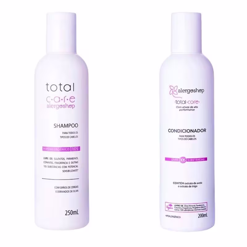 Shampoo para todos os tipos de cabelo total care. 250ml livre de 105 substâncias alergênicas. através de pesquisas foram levantados 105 principais substâncias com potencial nocivo presentes em cosméticos. Para a linha total care a alergoshop retirou de suas formulação essas 105 substâncias e as substitiu por ingredientes seguros, que atuam com eficácia comprovada e performance garantida. o shampoo total care pode ser usado por todos os tipos de cabelo e por ser livre de sulfatos, evita o desbotamento das colorações. seu sensorial é delicado e seu ativo de cereais acalma o couro cabeludo e ajudam a restaurar os fios.