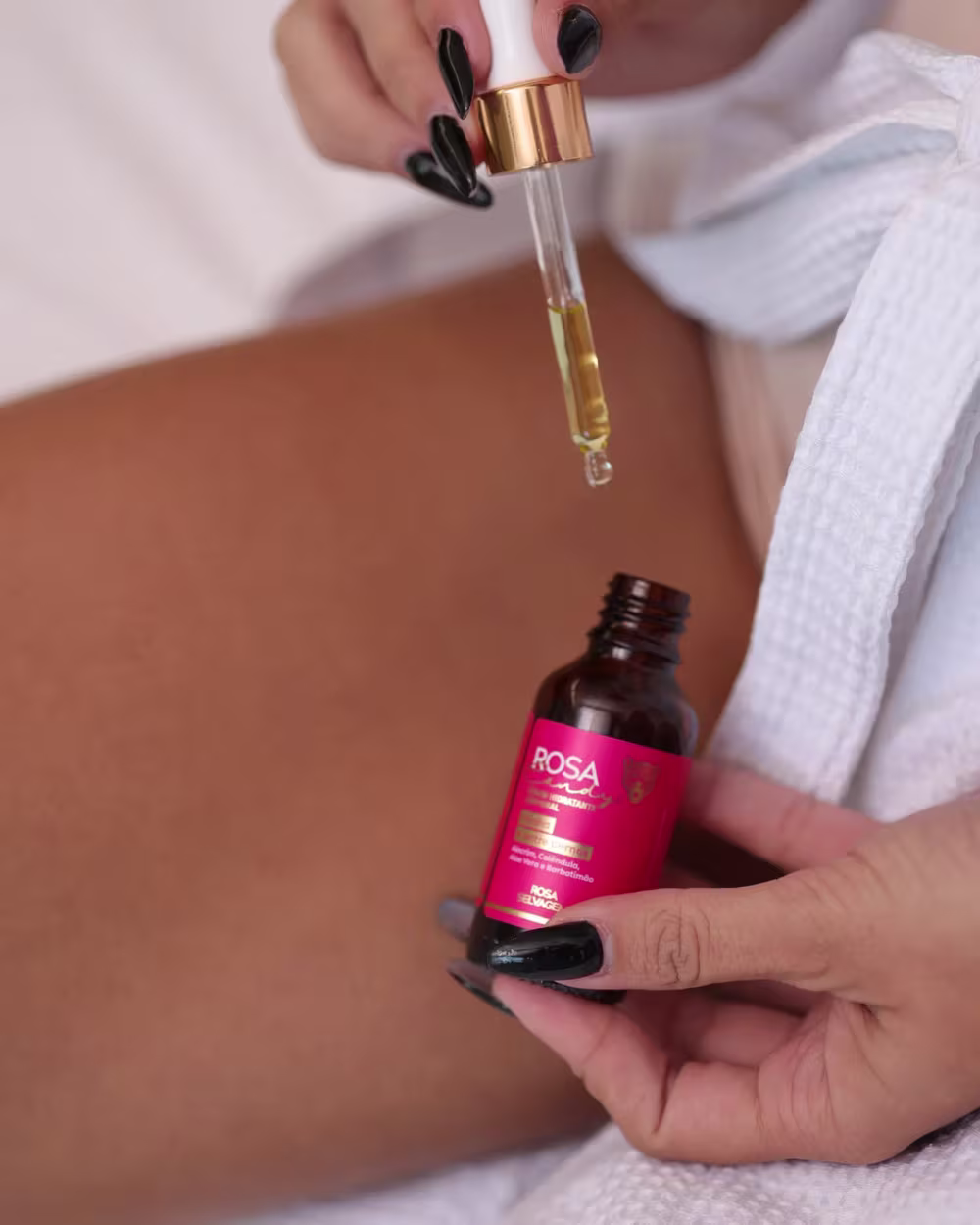 Clareamento e Regeneração: O Óleo Clareador possui ação rejuvenescedora, melhorando a elasticidade e o brilho natural, enquanto combate manchas e estrias.